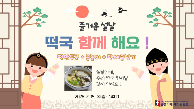 류미틴 예배 : 오늘은 류미틴(중고등부)가 따로 예배를 드리는 주일입니다. 신년 대심방 : 지금은 대심방 기간입니다. 심방을 원하시는 분은 신청하시기 바랍니다. 중고청 연합 새벽기도회 ...