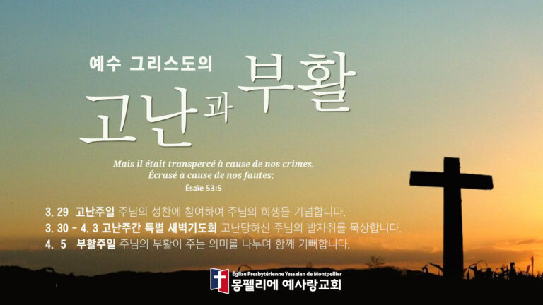 소방안전 특강 : 예배 후 이어서 건물 내 소방 안전 특강을 실시합니다(담당:박성환 집사님). 고난주일 : 29일(주일)은 우리를 위하여 고난 당하신 예수님을 기억하는 고난주일로 ...
