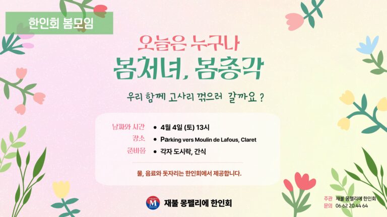아름다운 봄을 맞아 한인회에서 봄 고사리를 꺾으러 간다고 합니다.준비물은 각자 도시락과 간식을 준비하시면 됩니다. 위치는 몽펠리에에서 자동차로 30~40분 정도 걸리는 거리에 있으며, 아쉽게도 ...