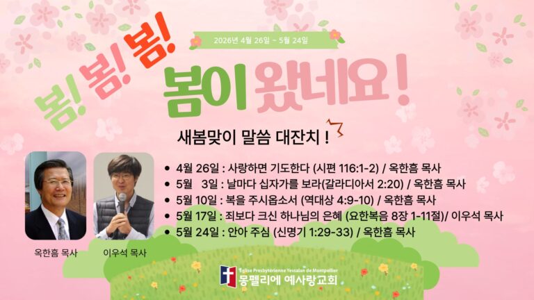찬양예배 : 오늘은 찬양예배로 드립니다. 선교헌금 : 오늘은 153선교헌금을 드리는 주일입니다. 목회자 동정 : 최성묵 목사님 부부는 잠시 한국을 방문하십니다 ...