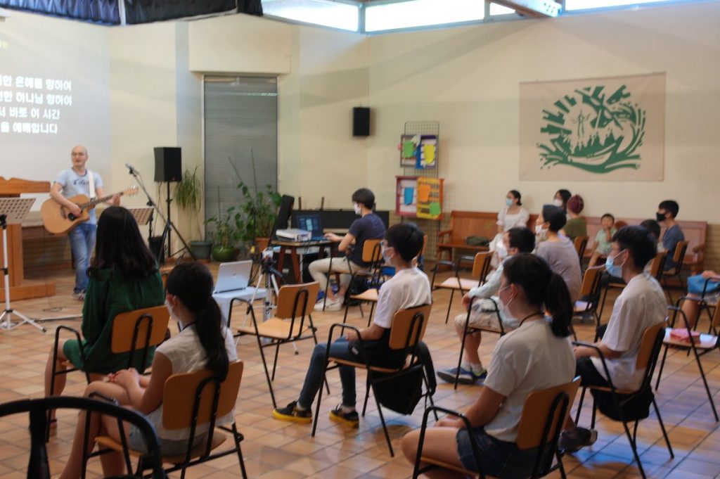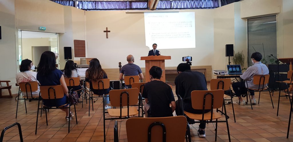 드디어! 드디어 예배당에서 주일 예배를 드리게 되었습니다. 예배당 입구에 마스크와 손 세정제, 온도계를 준비하고, 의자들의 거리를 떼어 두어 만전을 기합니다.