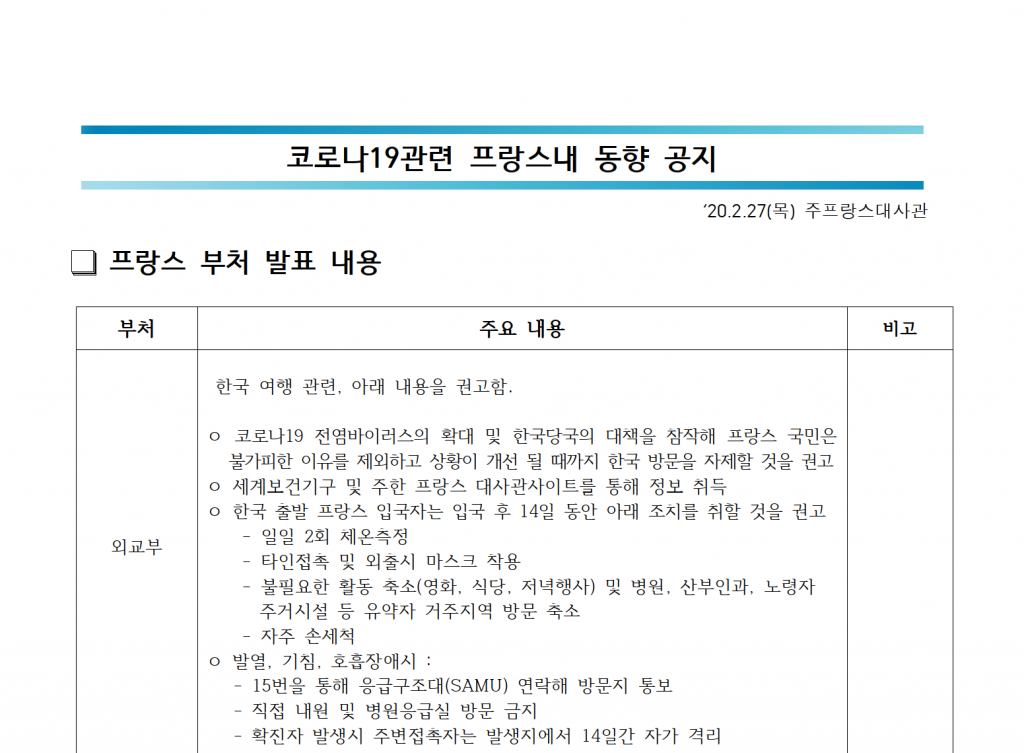 코로나 19와 관련된 프랑스의 동향에 관하여 파리에 있는 대한민국 대사관의 공지 내용이 다음과 같습니다. 참고하시고 적절하게 대처하시기 바랍니다.