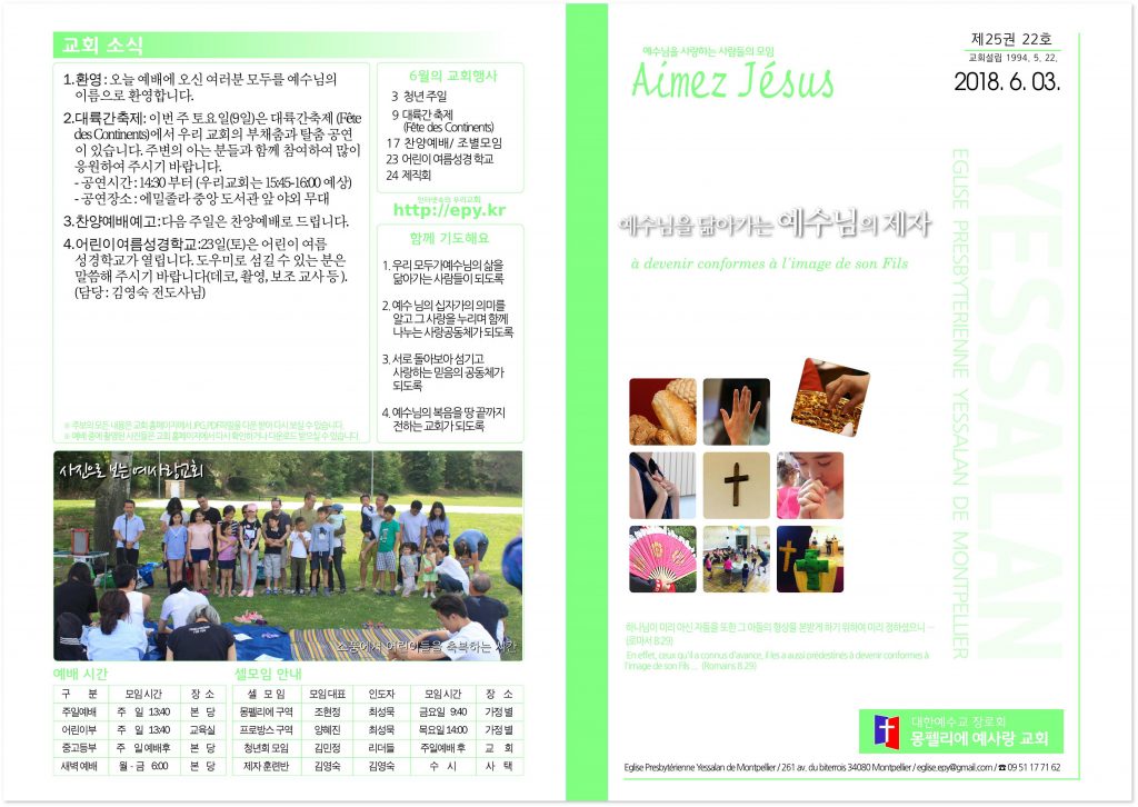1. 환영 오늘 예배에 오신 여러분 모두를 예수님의 이름으로 환영합니다. 2. 대륙간 축제 이번 주 토요일(9일)은 대륙간축제 (Fête des Continents)에서
