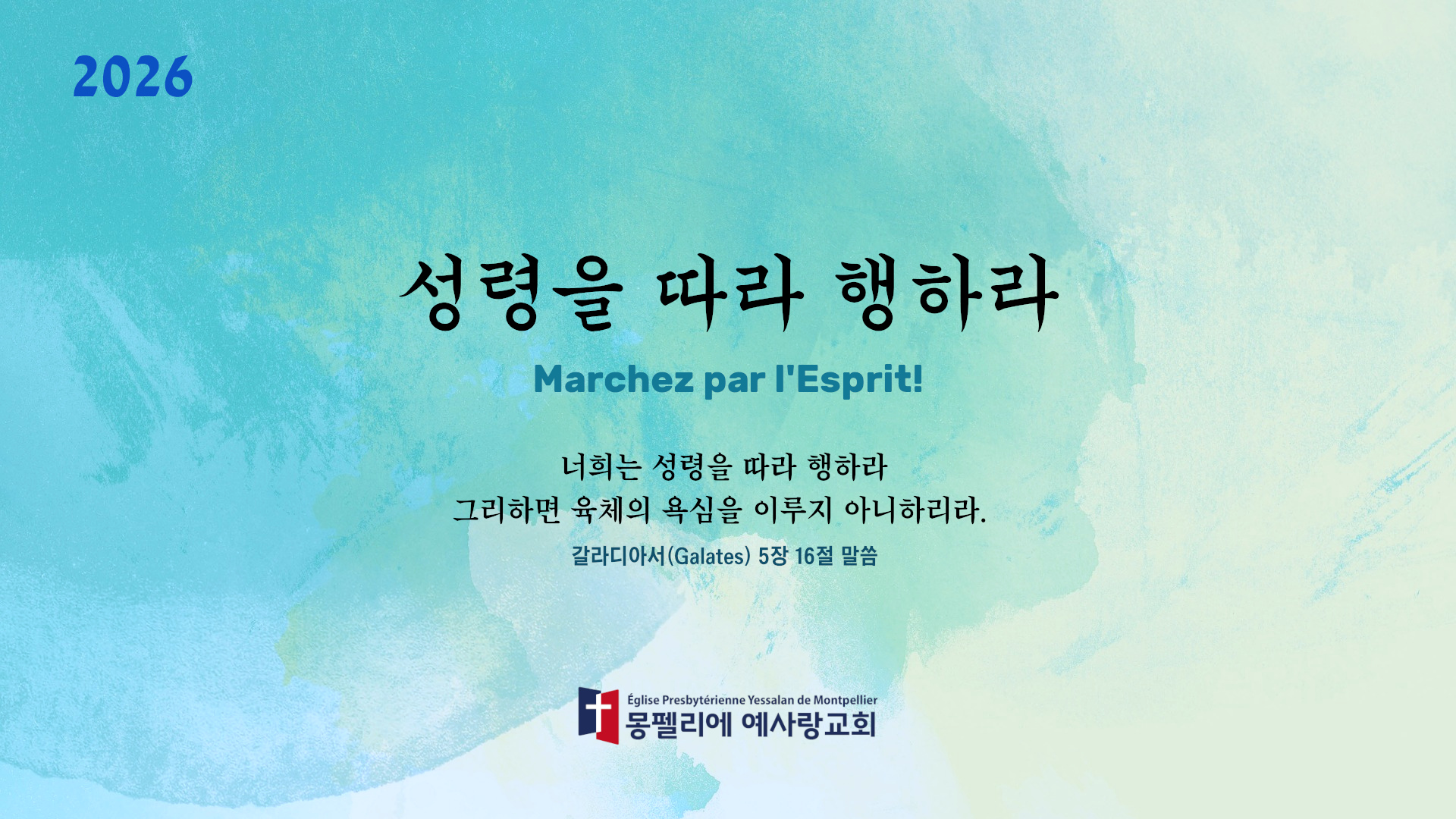01/01/202601/01/2026특별행사 안내 2026년 표어 : 성령을 따라 행하라! 2026년 한 해의 우리교회 표어는, 성령을 따라 행하라!Marchez par l’Esprit! 입니다. 내가 이르노니 너희는 성령을 따라 행하라 그리하면 육체의 욕심을 이루지 아니하리라. […]