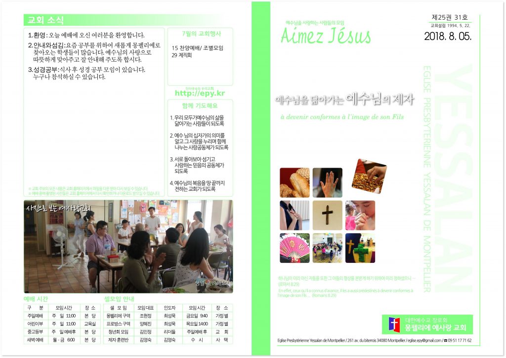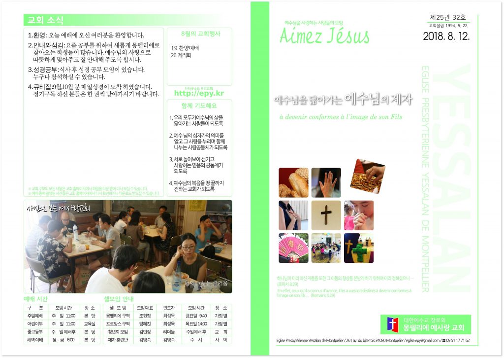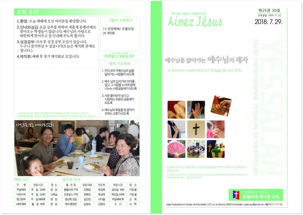 1. 환영 오늘 예배에 오신 여러분을 환영합니다. 2. 안내와 섬김 요즘 공부를 위하여 새롭게 몽펠리에로 찾아오는 학생들이 많습니다. 예수님의 사랑으로