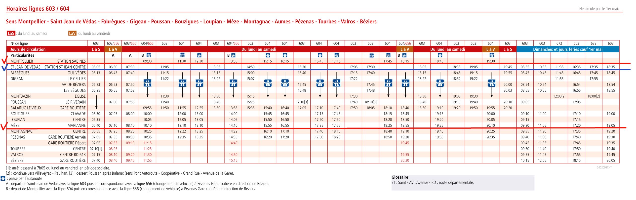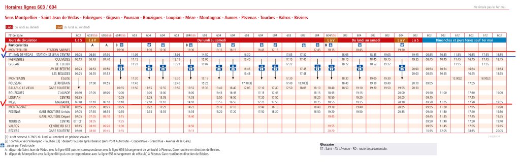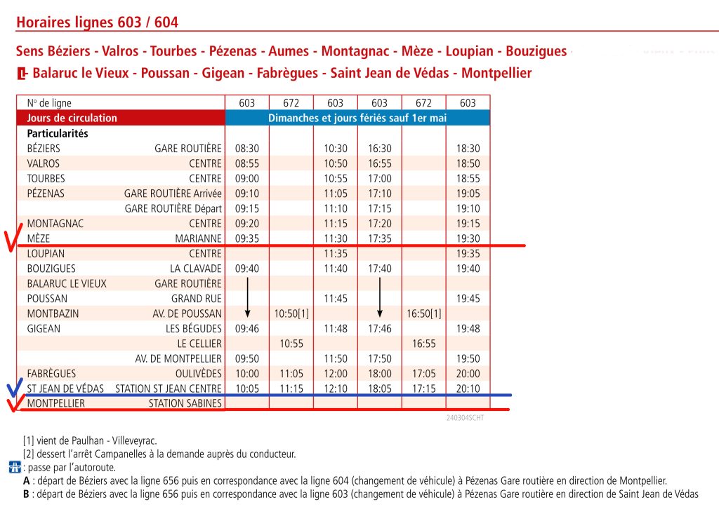 다음 표는 몽펠리에에서 메즈까지 또는 메즈에서 몽펠리에까지 이동하는 버스 시간표를 나타냅니다.